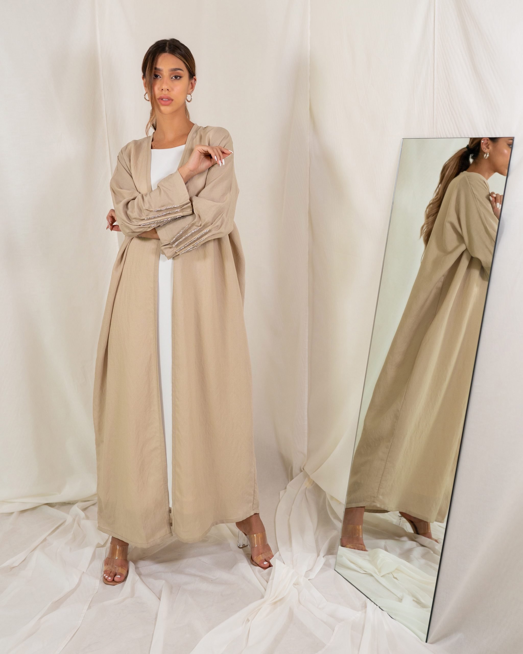 An all-time season piece, this lightweight metallic-shine silk cotton fabric modern abaya is designed in an oversized straight cut fit, with 5 delicate fully crystal embellished pleats on both sleeves. It features an almost closely matching color chiffon fabric scarf.