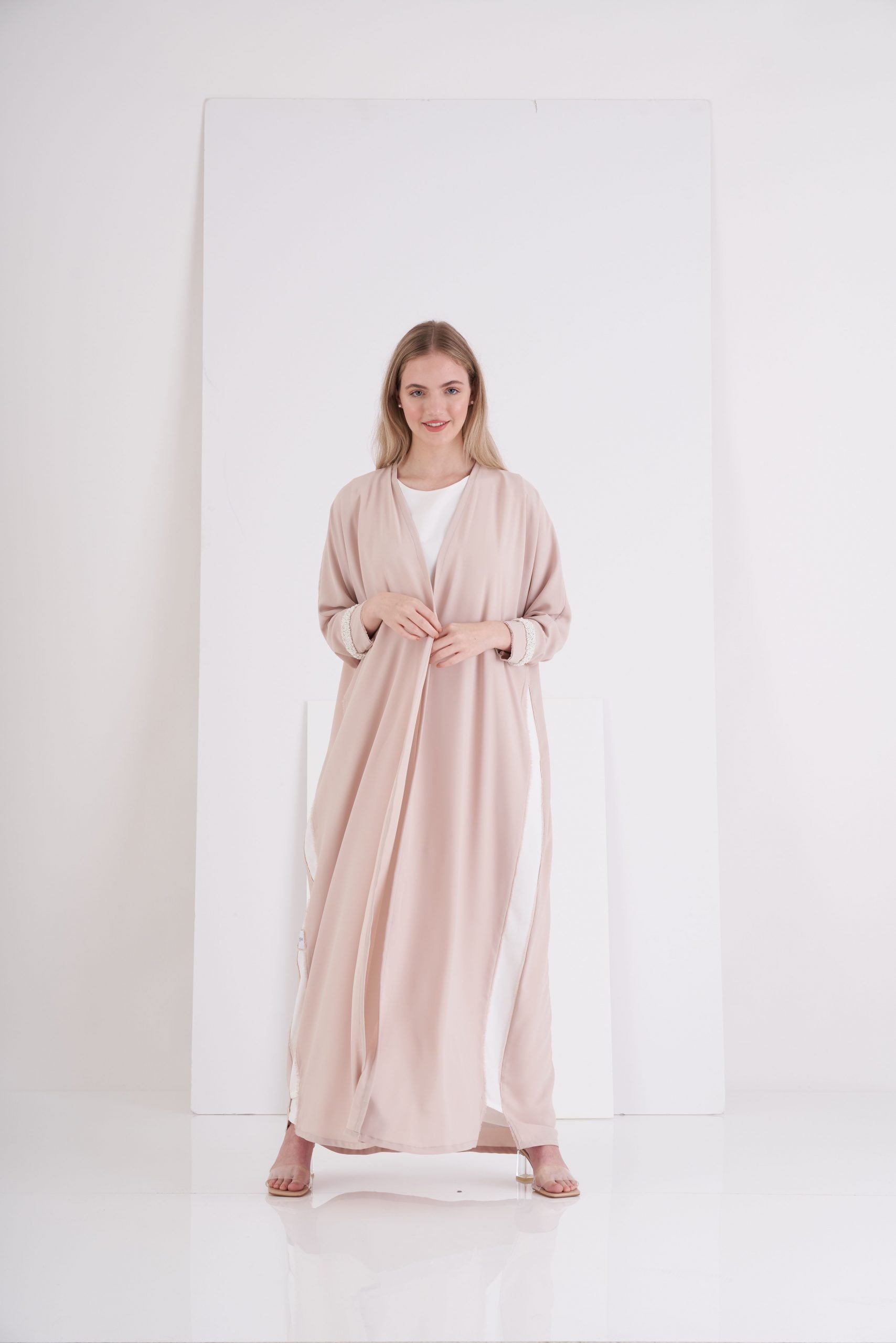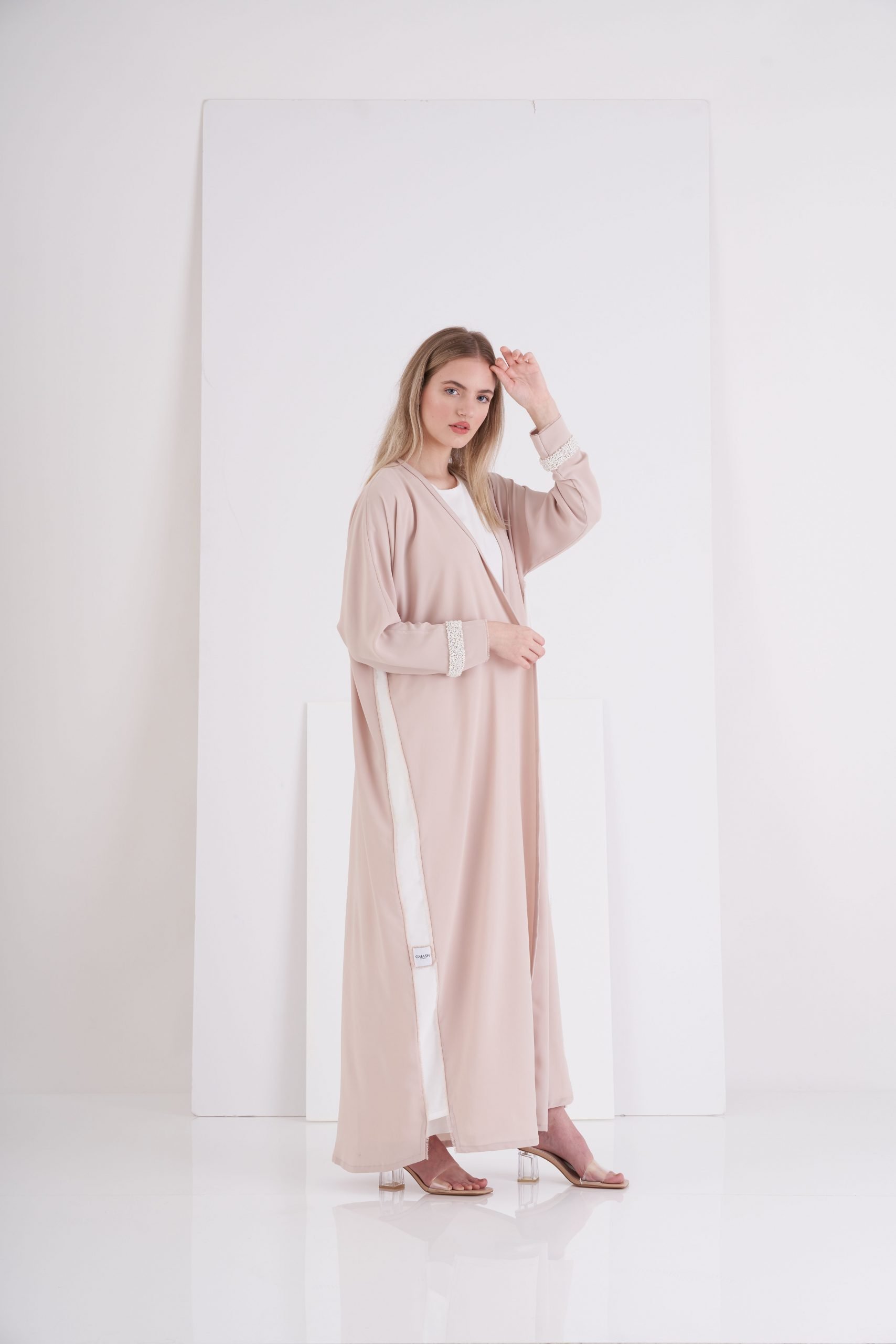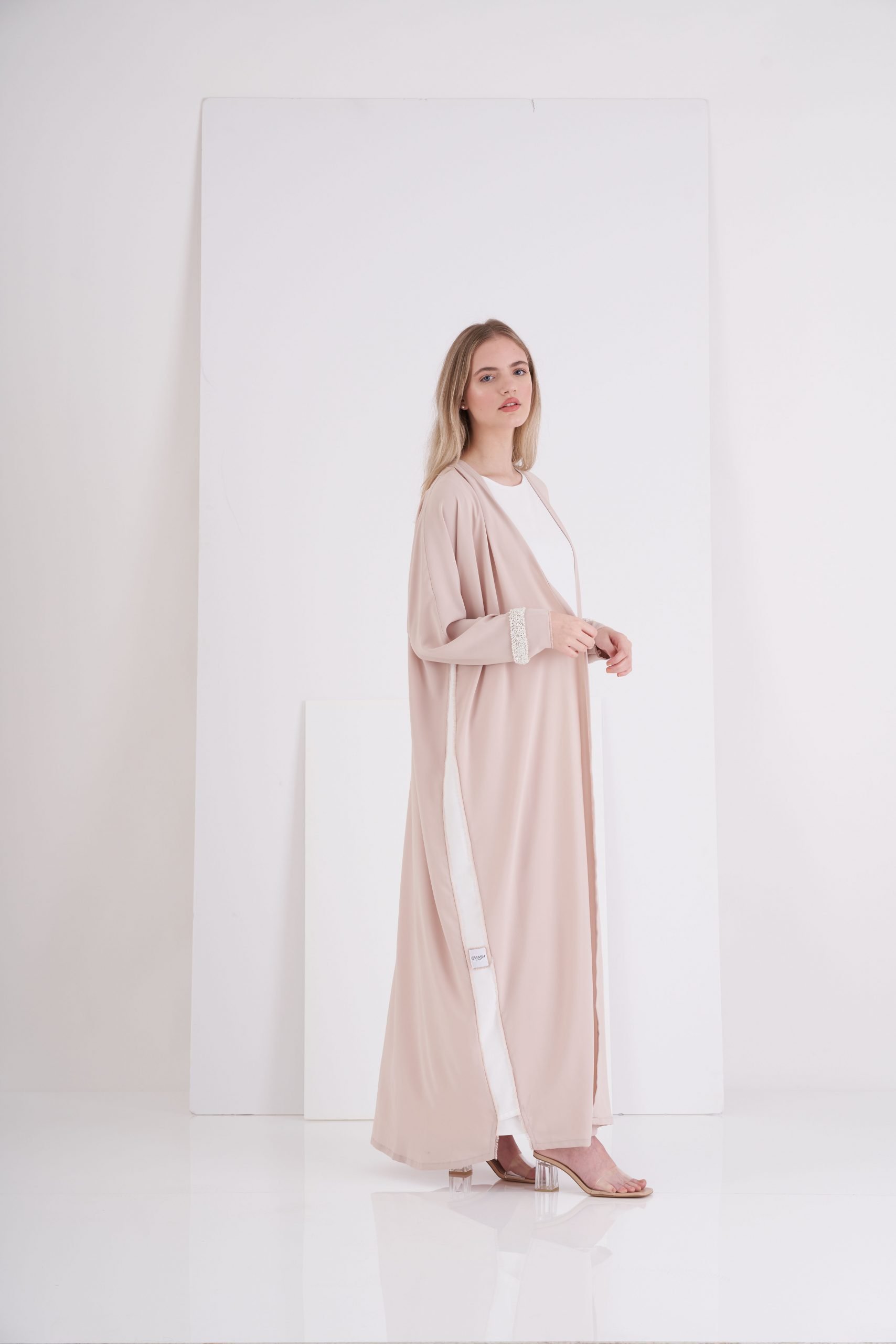 An all-time season piece, this light-weight modern abaya is designed using soft matte crepe fabric in an oversized A cut fit, with delicate fringed sleeve edges complimented by beaded small white pearls. It features elevated white open fringed abaya sides and an almost closely matching color chiffon fabric scarf.