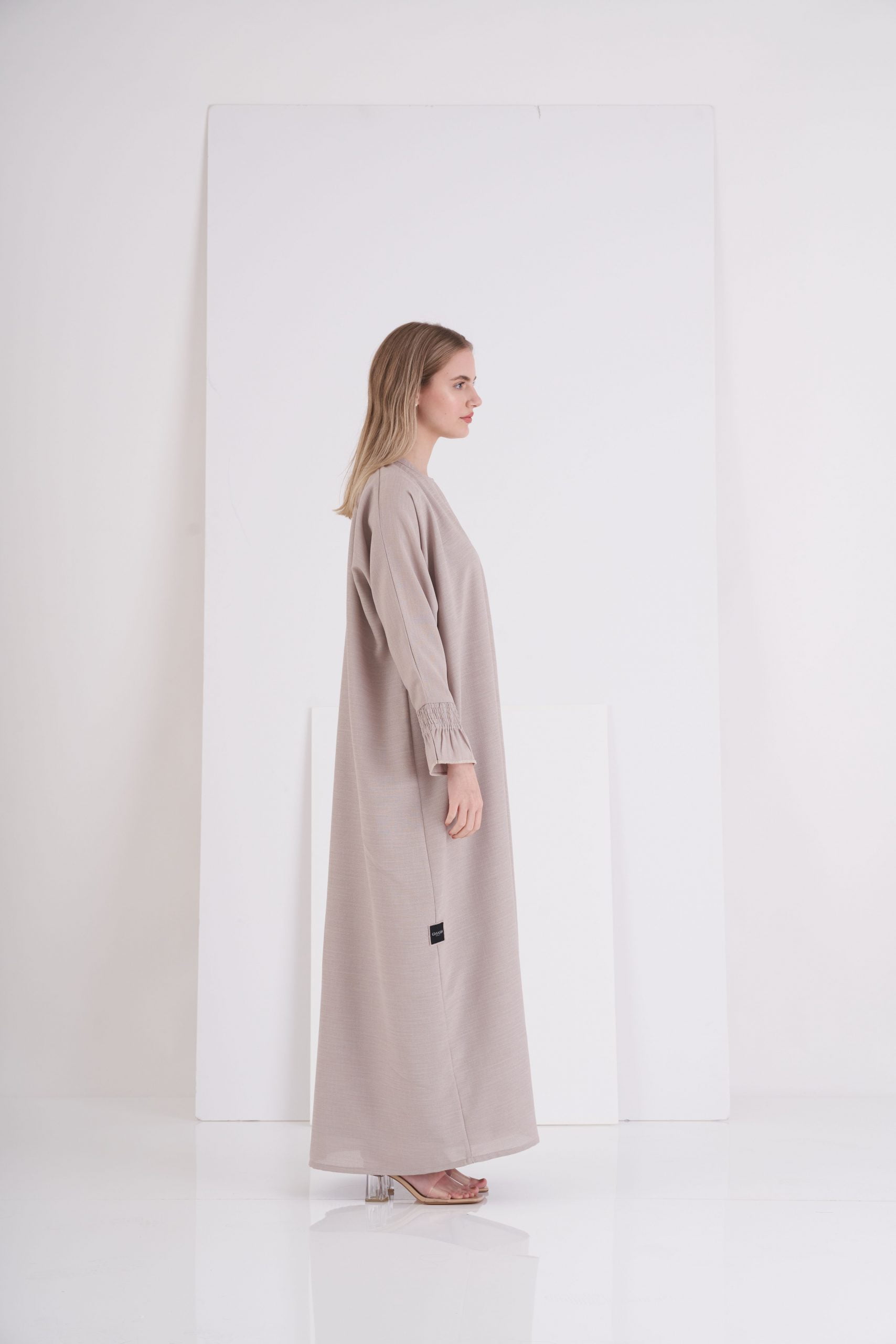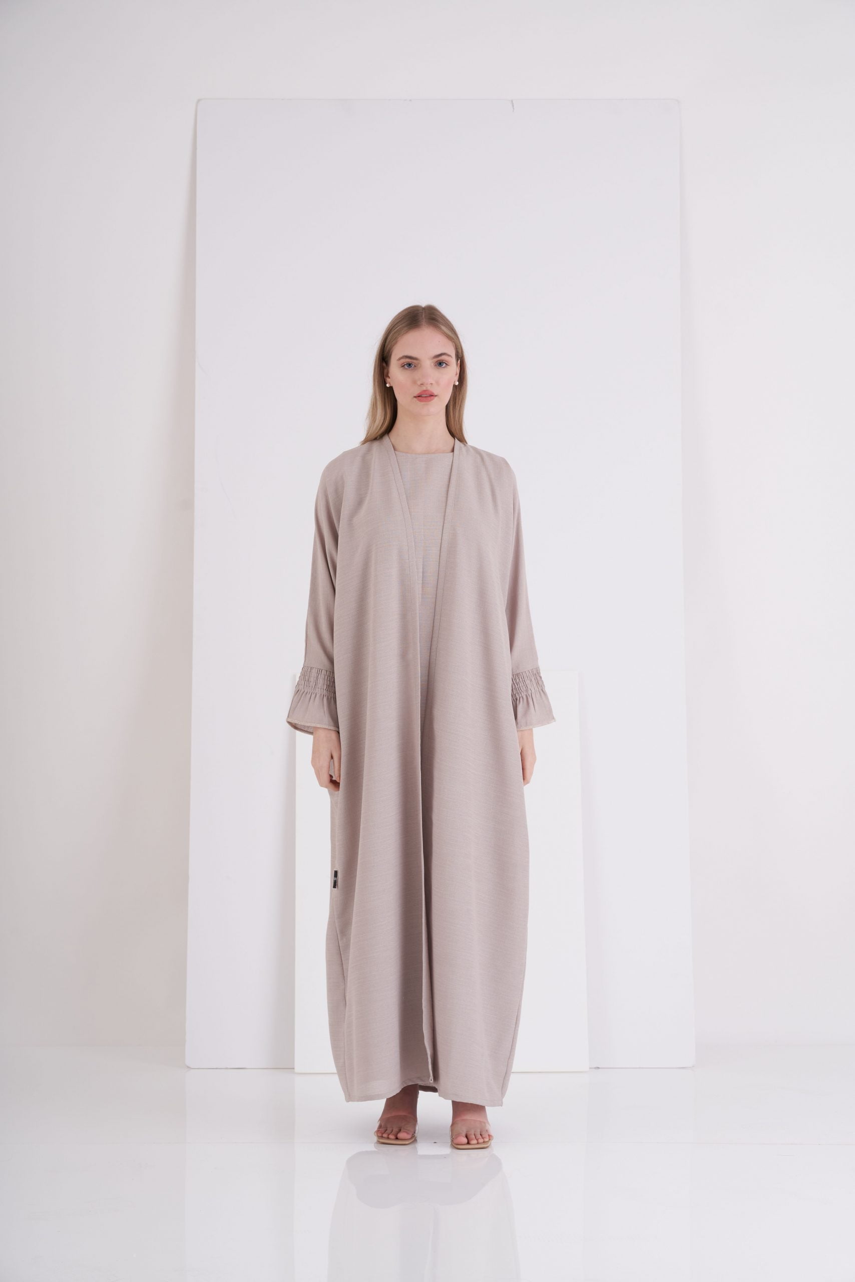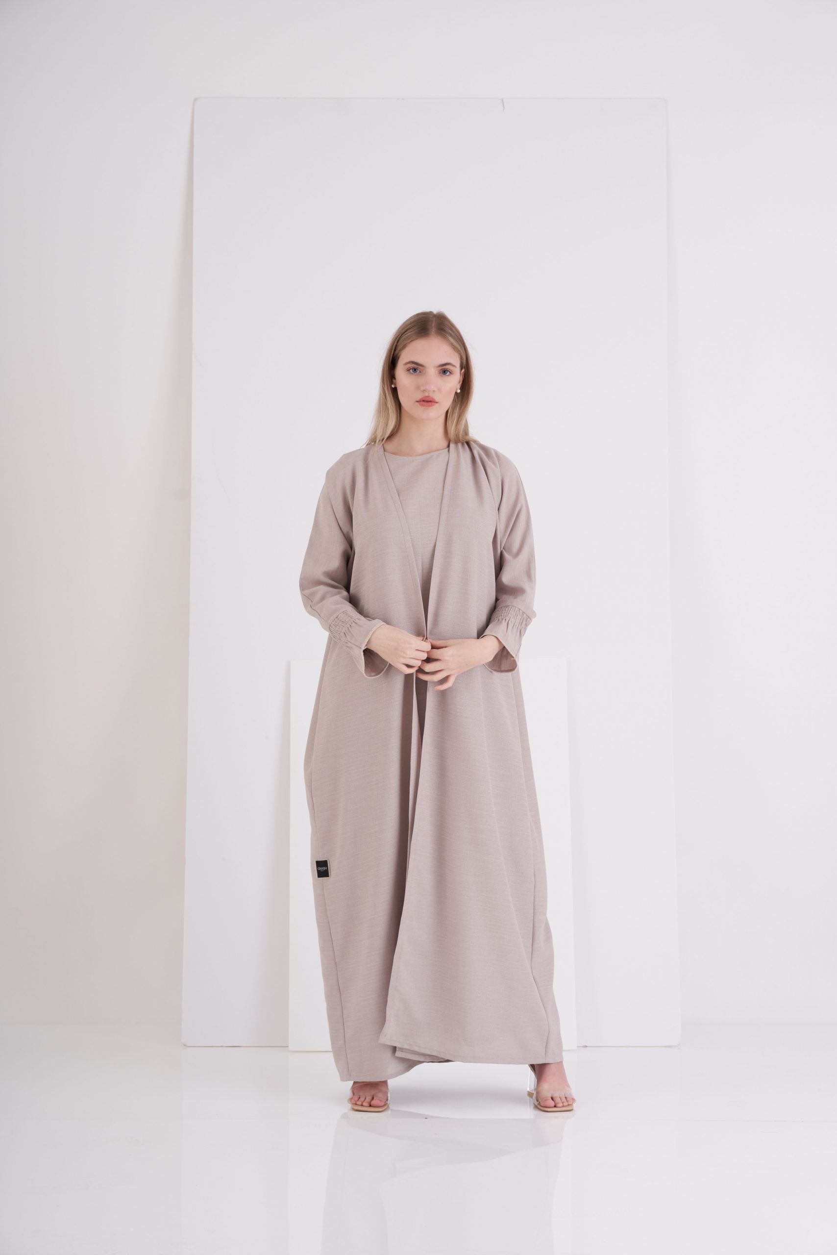 A fall/winter season closet essential piece, this medium to heavy-weight modern abaya is designed using structured matte linen fabrics in an oversized A cut fit, with elastic pleated sleeves and overly thread stitched sleeve edges. It features an undergarment sleeveless dress to match the initial abaya fabric and color.