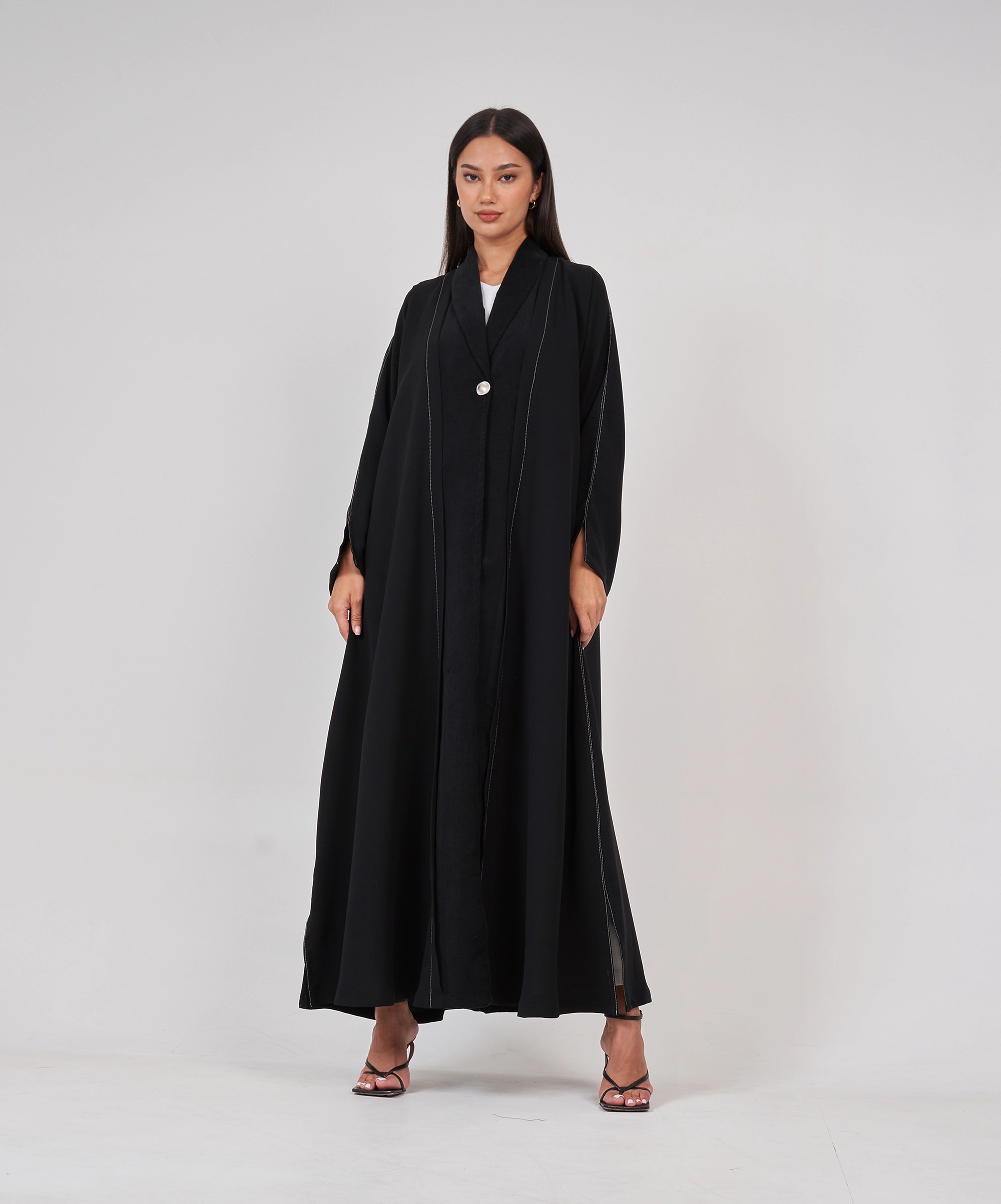 An all-time season piece, this medium-weight modern abaya is designed using soft crepe fabric and soft corduroy fabric in an oversized cloche cut fit, in the style of a stitched on abaya to a middle semi-looking dress in a different fabric. It is complimented by sleeve and side slit cuts, with an overlapping buttoned deep collar. It features an almost closely matching color chiffon fabric scarf.