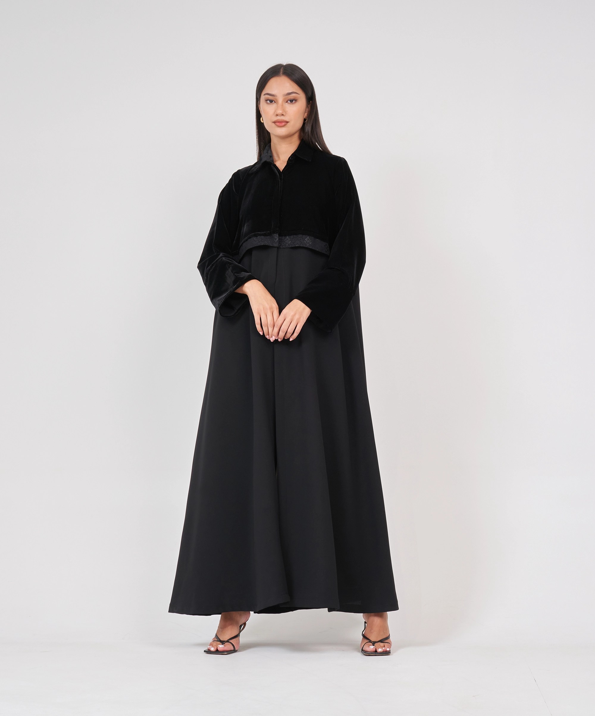 A winter/Autumn season piece, this medium-weight modern abaya is designed using soft crepe fabric in an oversized cloche cut fit with a combination of other fabrics including velvet and linen taffeta jacquard, in the style of a collared abaya. The upper part can partially be closed by attached shirt buttons. It features an almost closely matching color chiffon fabric scarf.